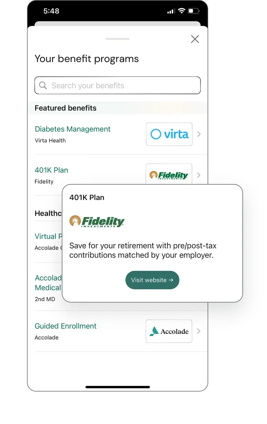 - View all employer-sponsored benefits, including point solutions, partner programs, even 401(k)